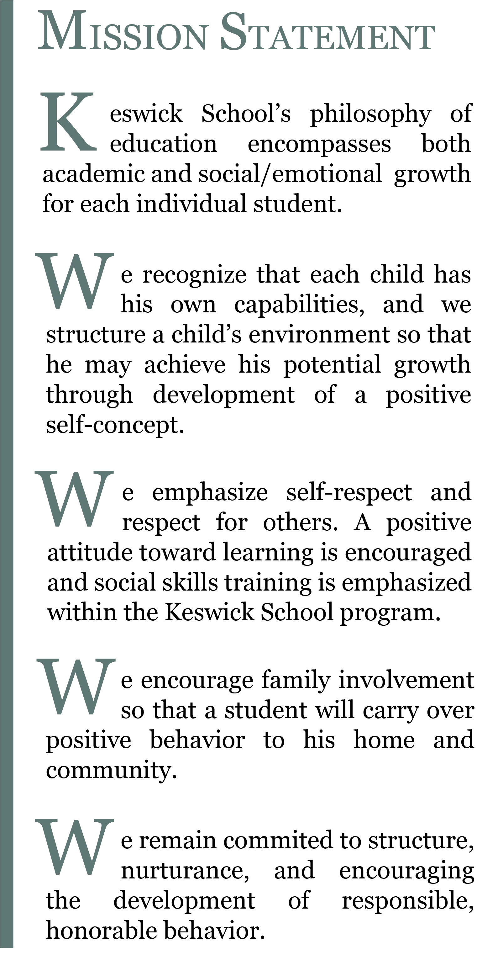 Founded in 1963, Keswick School is internationally recognized as a leader in long-term residential treatment for boys with complex social-emotional, executive functioning, and learning needs. We believe that meaningful relationships and continual opportunities to succeed help bring each child’s unique potential to light. We seek to make lasting change for our students as they develop a positive self-concept rooted in independence, resilience, and integrity. With nurturance, structure, and a nuanced understanding of each child, our mission is to provide our students and their families with the resources and support necessary to achieve sustained success for a lifetime at home, in school, and in the greater community.